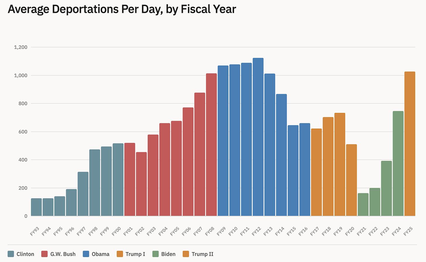 So far the second Trump administration has deported something like 1000 people per day. This is about the same as Obama, but way higher than Biden. These numbers seem to be ramping up, but so far, there aren’t really any more people being deported than a decade ago.