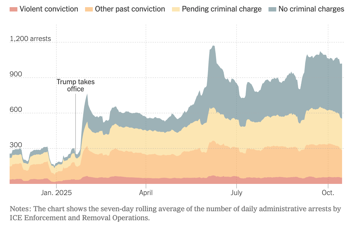 Also, the fraction of those who have committed a violent crime remains small, about five percent — just the red fraction at the bottom of the New York Times chart above. Whatever the justification for these deportations, they are mostly not removing violent criminals, as DHS claims.