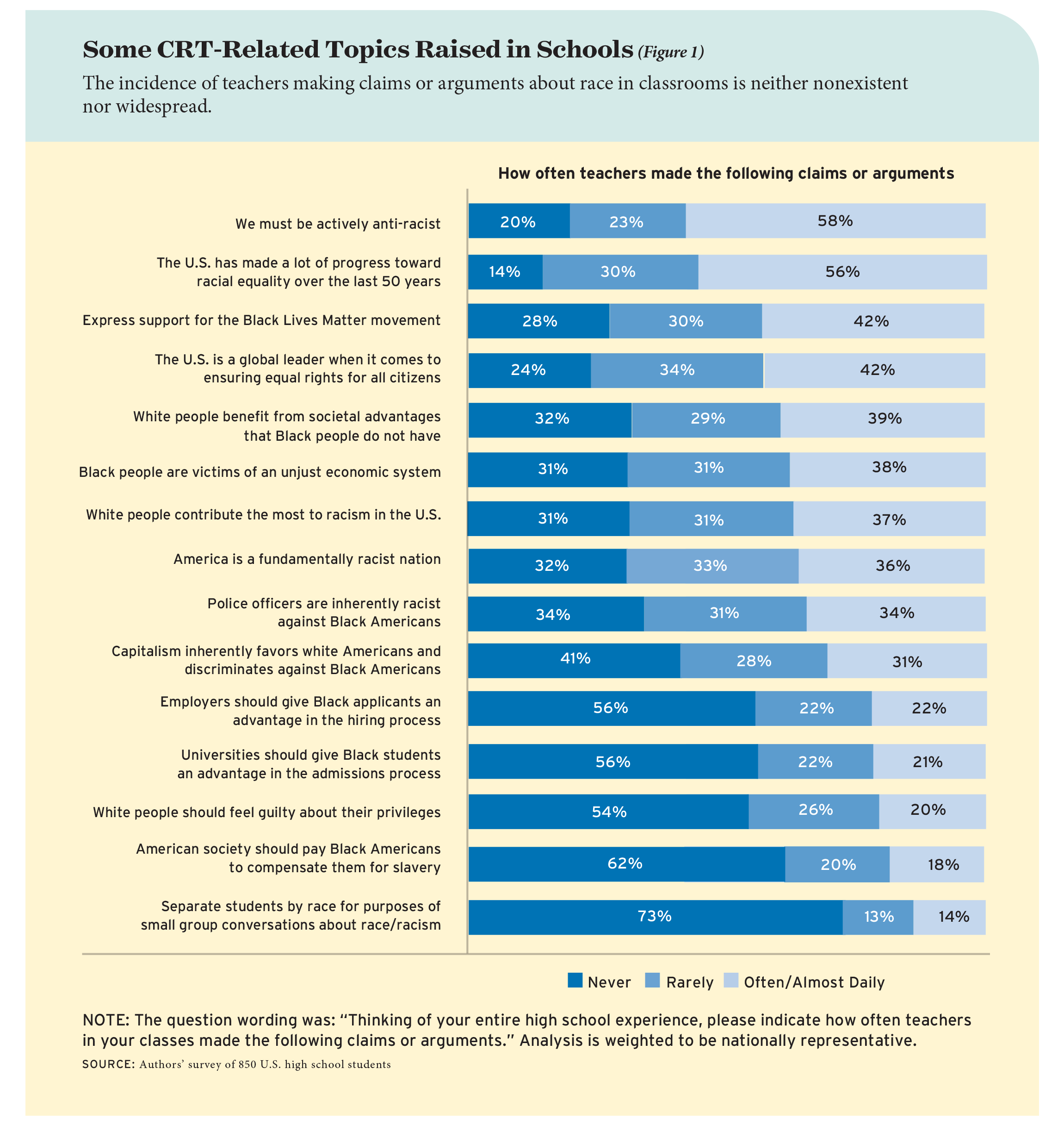 Overall, one thing that seems clear from our data is that, in the public debate about CRT in education, people on opposing sides are largely talking past each other. Those who think CRT-related instruction is nonexistent should know that it isn’t. Those who think it’s an epidemic should be aware that this isn’t true either. And those who are concerned about indoctrination in education should know that most youth report forming their political beliefs from sources outside of the classroom.