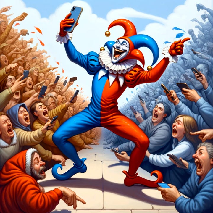 Image prompt: The jester’s exaggerated and fun costume, along with a lively pose and a smartphone, embodies the spirit of a mischievous online satirist. The crowd’s reactions have a slight comedic undertone, and the background is simplified, ensuring the image remains engaging and easy to understand in a smaller format.