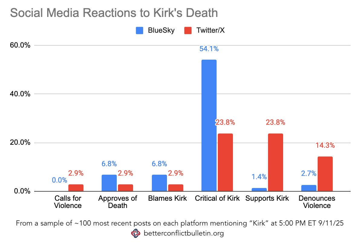 But let’s step back, take a breath, and ask: how many people are actually reacting to this atrocity with support for more violence? All major platforms have warned users that celebrating violence is against their terms of service, but there is in particular a vocal argument about whether BlueSky users support Kirk’s killing. No they don’t, yes they do, and more careful assessments saying it’s mixed.