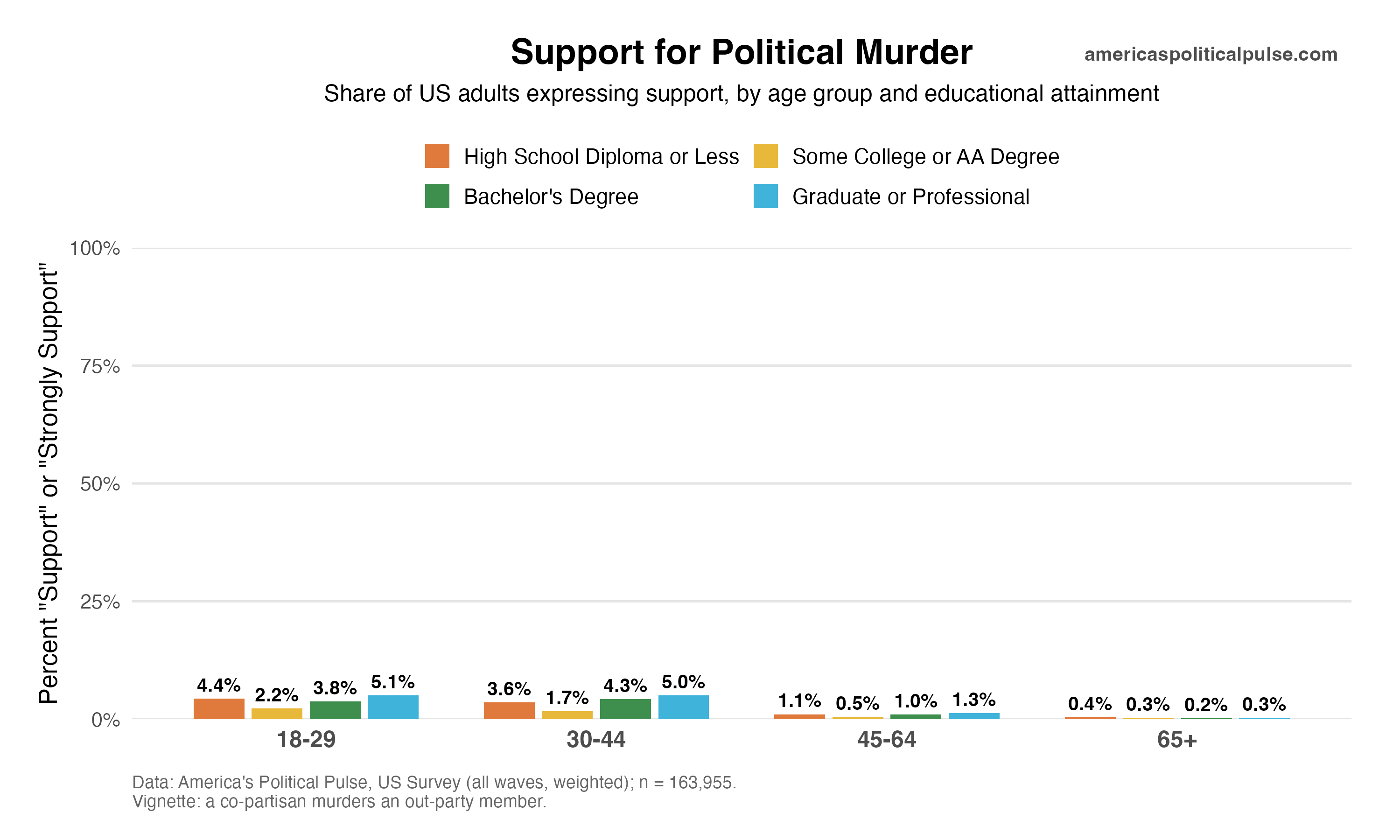 We have repeatedly noted that support for political violence is a lot lower than simple surveys suggest it is, for a variety of methodological reasons. Sean Westwood, who runs the Polarization Research Lab, has made much more careful measurements, and brought out his own data in reply: