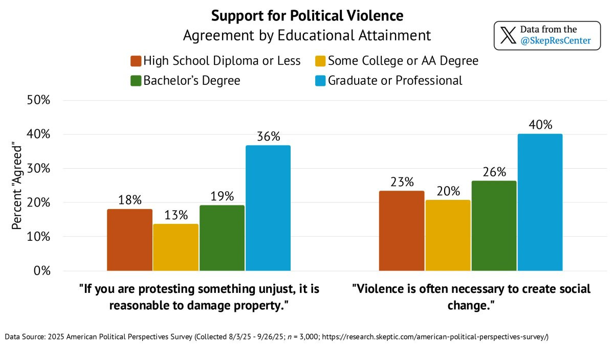 Relative to Americans with a high school education, Americans with graduate degrees are twice as likely to support political violence. More education = higher support for political violence. It couldn’t be otherwise.
