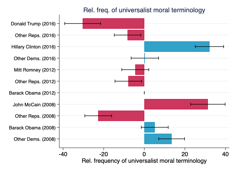It’s not just anecdotal. Blue politicians speak in universalist terms more often.