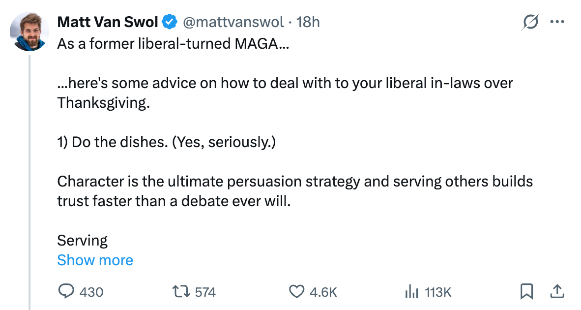 I recently ran across Carrie Graham’s Thanksgiving 2020 guide and sure, this was written after the previous election but the basics don’t change. And it’s by someone who has a ton of experience coaching people through this, foundational stuff like this:
