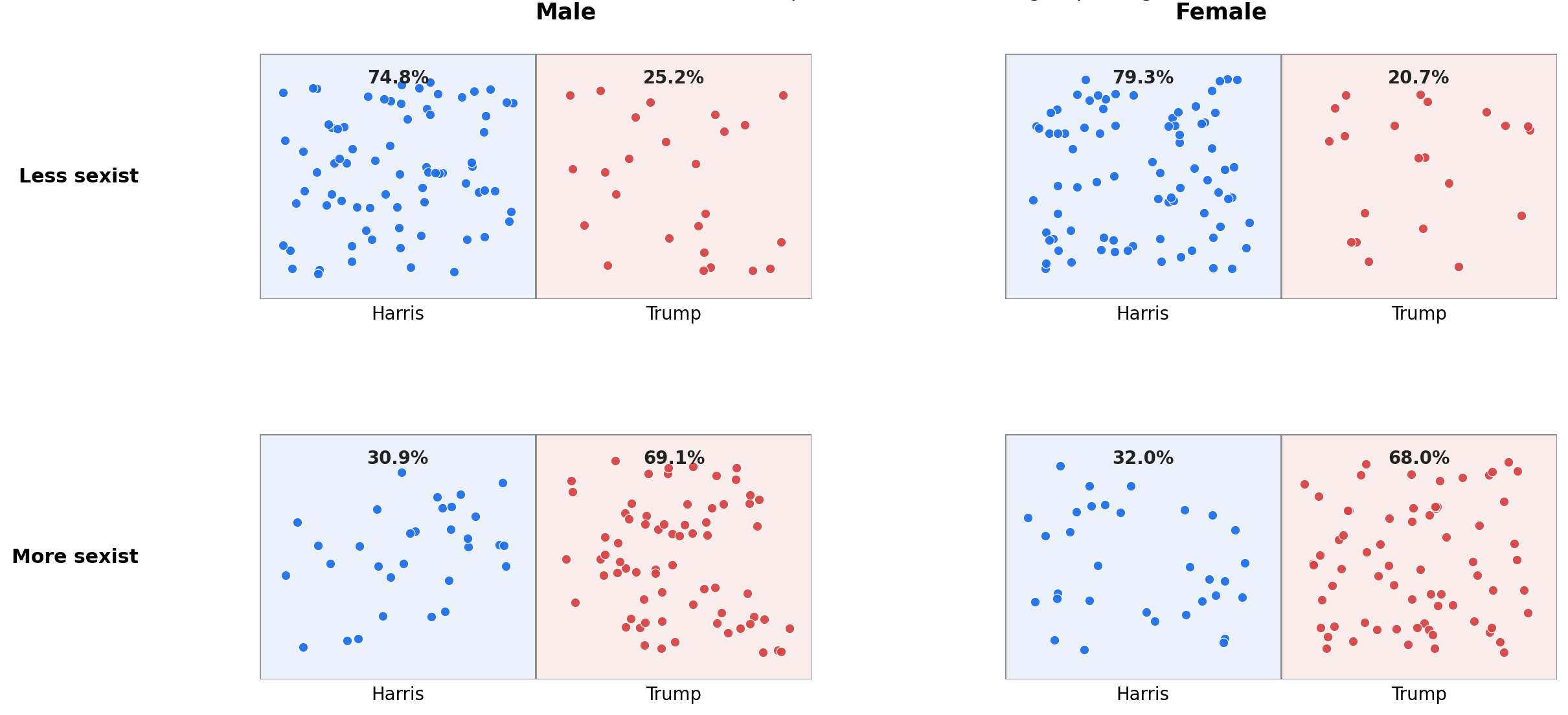 Less sexist people definitely voted for Harris more, while more sexist people definitely went more for Trump. Interestingly, there is little difference between these patterns for men vs. women.