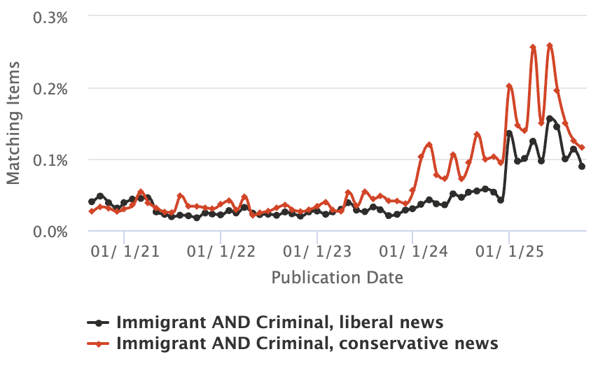 We are experiencing a narrative war over immigrants and crime. On one side, Trump frequently speaks of immigrants as criminals, and this association is definitely more common in Red media.