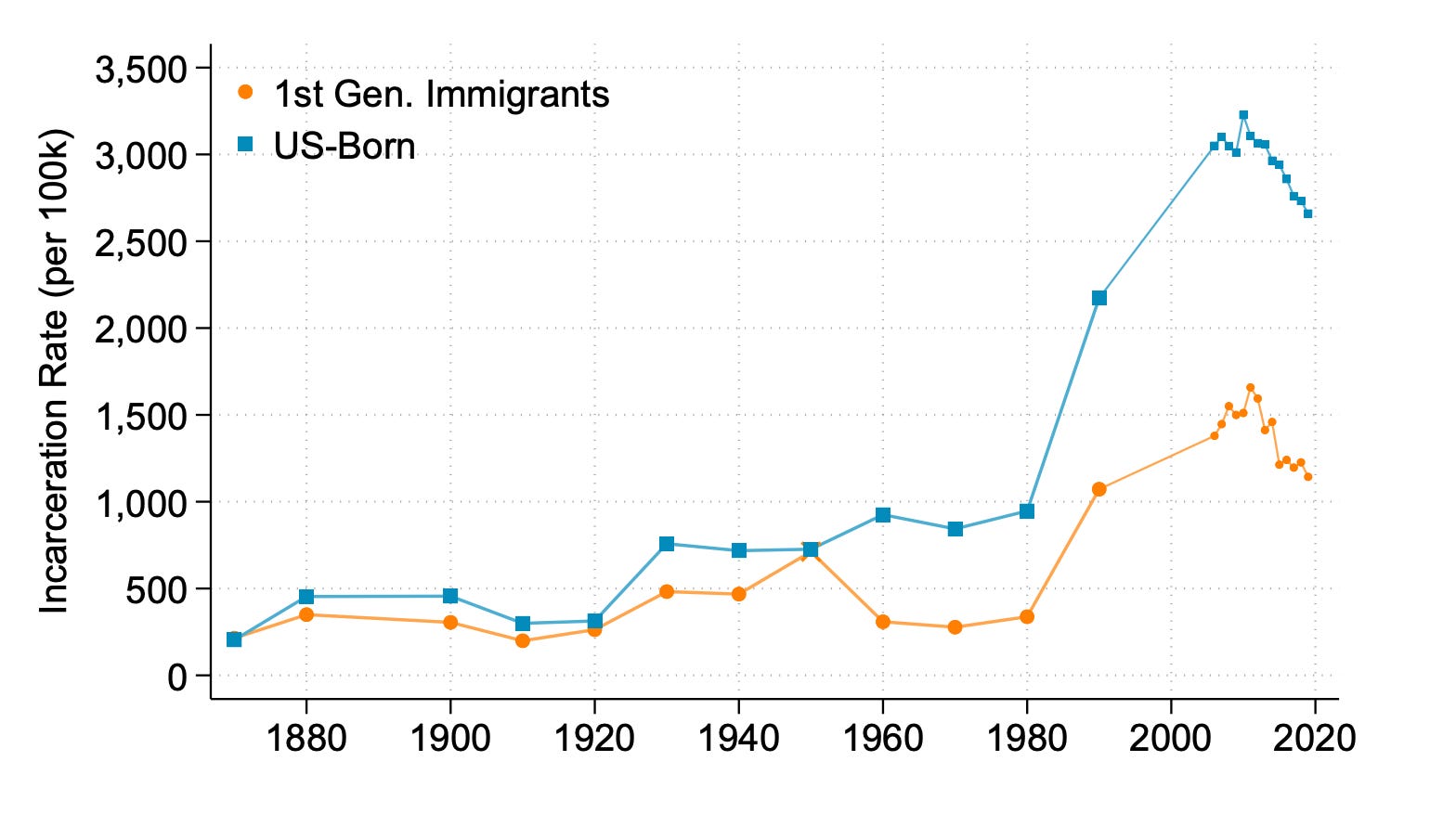 First things first: all the systematic evidence I could find suggests that immigrants (of whatever kind) have lower average crime rates. This seems to hold going back to at least 1870: