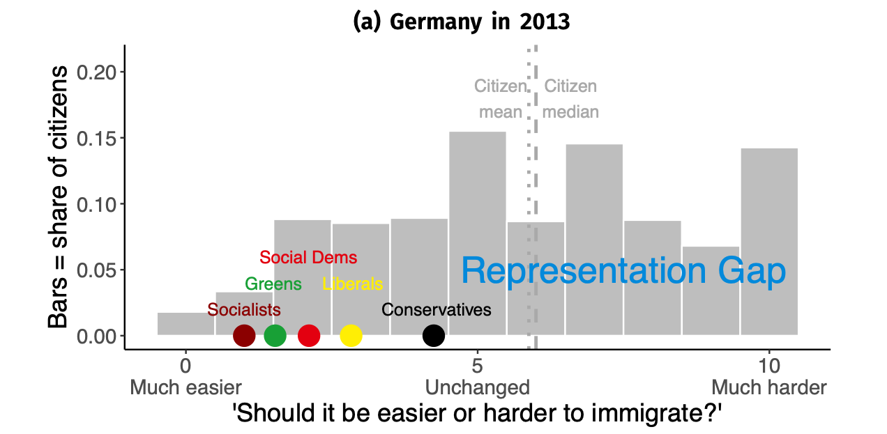 The rise of strongly anti-immigrant right-wing parties in the US and Europe has mostly been treated as an anomaly, some failure of democracy that begs an explanation. But a most provocative piece of recent research suggests that across Europe, this is just politicians coming into line with what their citizens always wanted. Here’s the distribution of views on immigration among German members of parliament from different parties vs. the broader population in 2013: