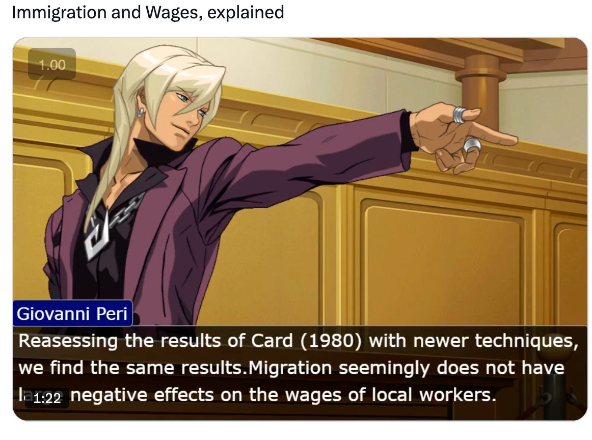 The effect of immigration on wages follows a similar local pattern. It might reduce pay for some types of jobs in some area for some time, but net wages increase on average. Personally, the best discussion of the effects of immigration on wages I’ve ever seen is this anime courtroom fight between academics: