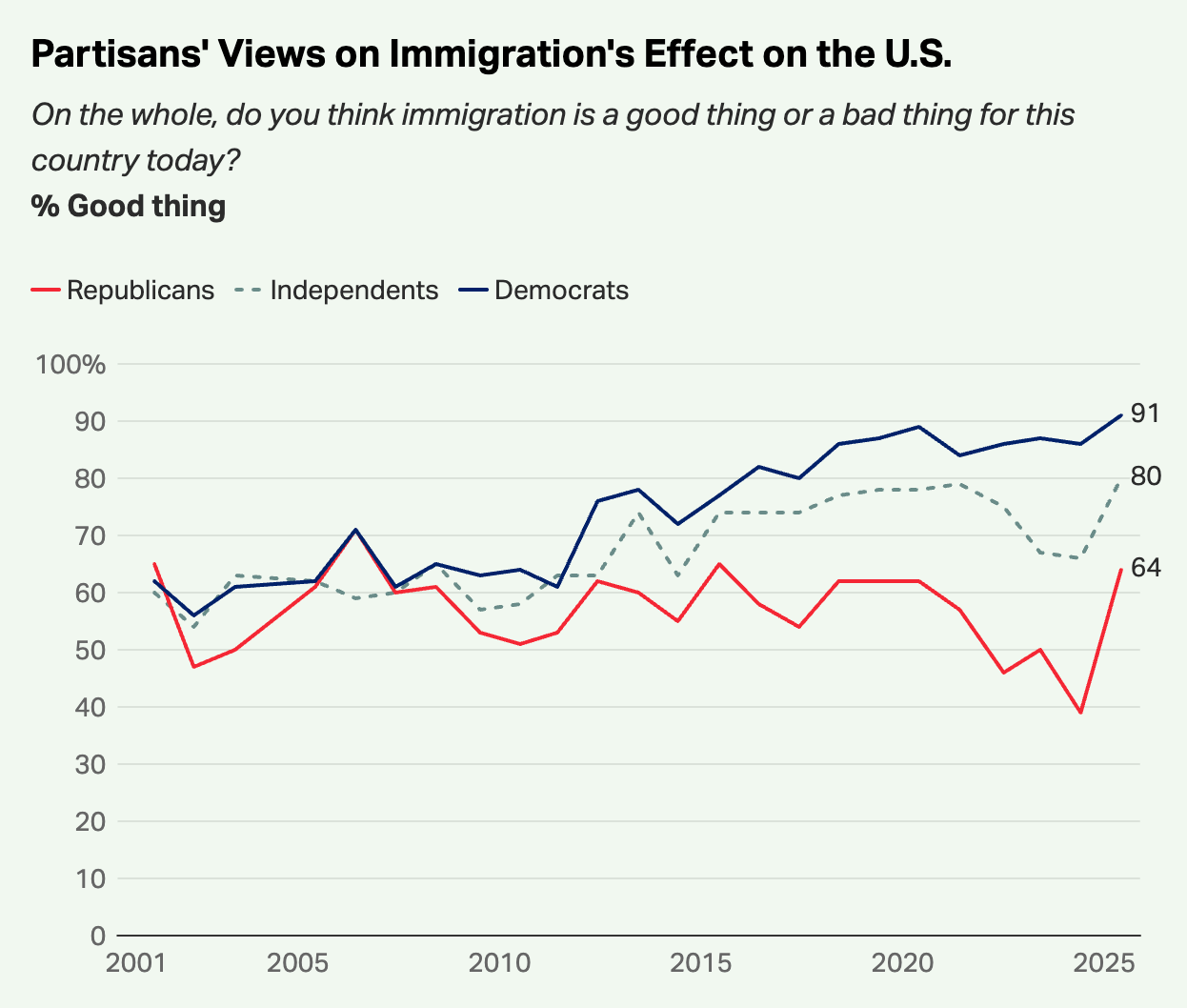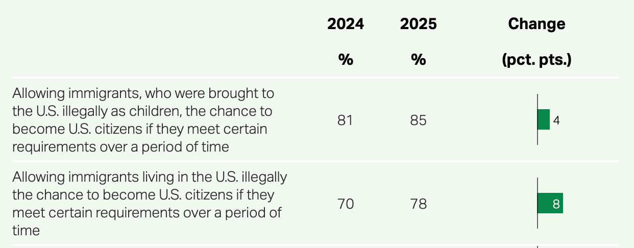 You may not know that support for legal immigration has been increasing across the board since Trump’s election. In fact, support for immigration rebounded after 2024 to a record-high of 79%.