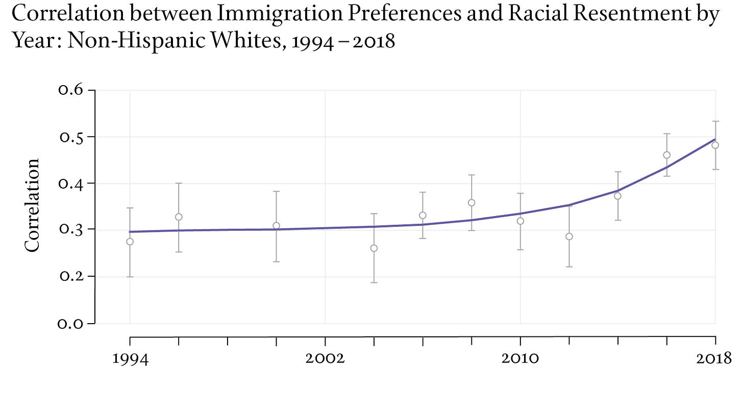 So there’s a relationship, sure, but anti-immigration people have a pretty wide range of scores on “racial resentment” tests. There’s definitely racism involved in American immigration politics, and some of it is very ugly. But there are lots of people who want less immigration who aren’t particularly racist (and also lots of racist people who want more immigration).