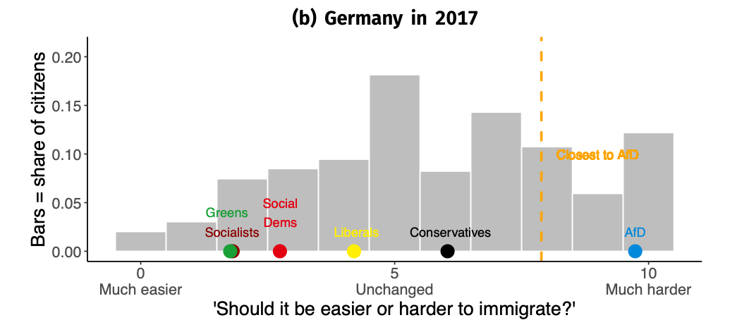 The introduction of the far-right AfD (“Alternative for Germany”) party caused the Conservative party to shift right to try to pick up people who would otherwise vote for AfD… and still the Conservatives actually ended up at about the mean citizen position (the orange dashed line is not the mean, it’s the dividing line between a Conservative voter and an AfD voter).