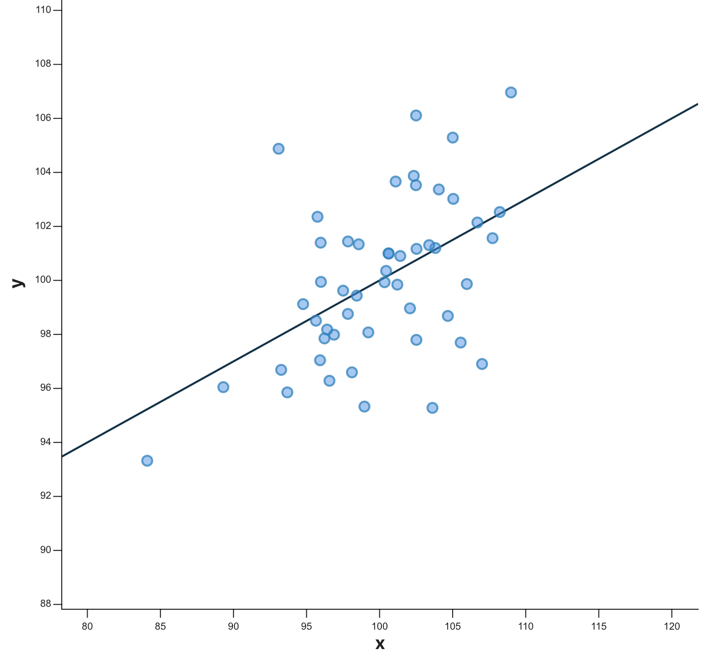 The individual-level correlation between “how many immigrants" and “how racist” has been increasing slowly over the past couple decades and currently stands at 0.5. Here’s what a plot with a correlation of 0.5 looks like: