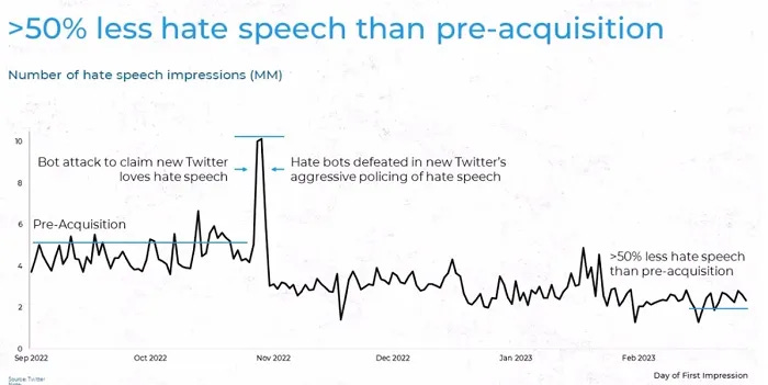 He posted this graph again on December 2, saying “Hate speech impressions (# of times tweet was viewed) continue to decline, despite significant user growth!” and promising that the @TwitterSafety team would release this data “weekly.” It does not appear that they did; the only further data I could find was this graph from March 2023: