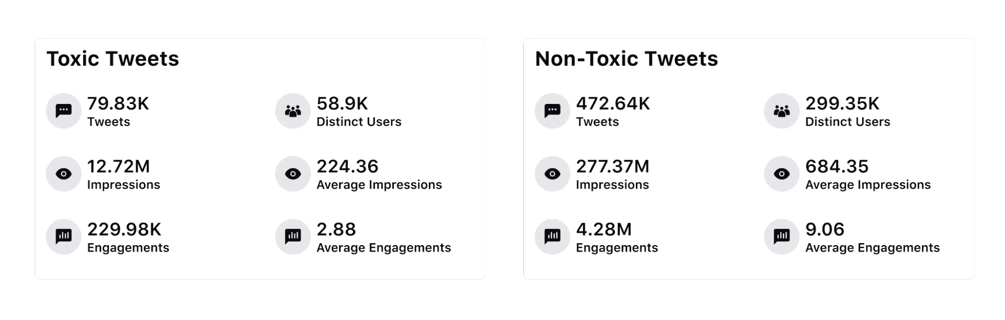What we do have is a March 2023 analysis of all public posts by analytics firm Sprinklr. Twitter made its internal list of over 300 slurs available to Sprinklr, and the company analyzed every post with one of these words from January and February 2023. They found that “toxic” posts received ⅓ of the impressions of “non-toxic” posts.