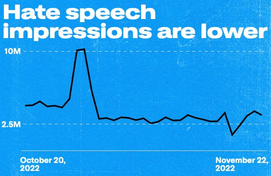 Musk’s counter-evidence consists of two graphs. On November 23, 2022, he tweeted: “Hate speech impressions down by 1/3 from pre-spike levels” with this graph: