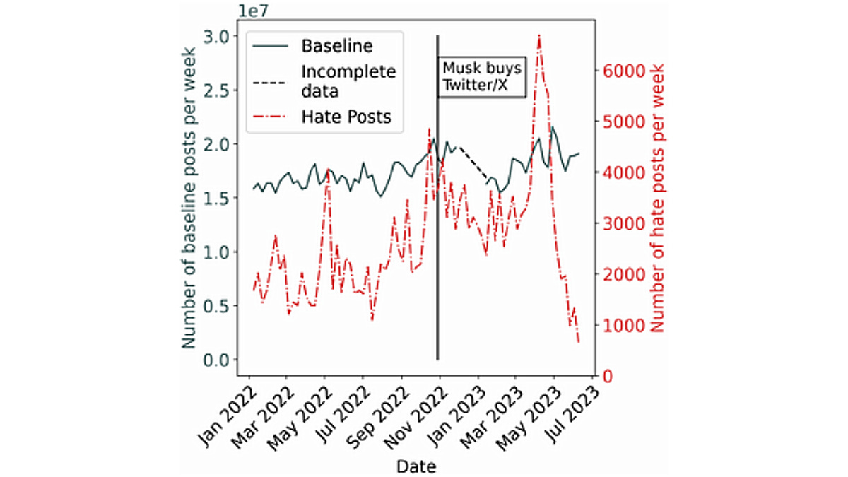 The best data we have on this comes from a peer-reviewed study by Hickey et al. which goes to June 2023. The authors used Google’s Perspective API to identify toxic posts and compared rates of “hate” posts to a baseline sample of random posts to account for potential user activity changes over this period. The headline is that hate speech posts were up approximately 50% in the post-acquisition period. But then hate posting collapsed in the summer of 2023.